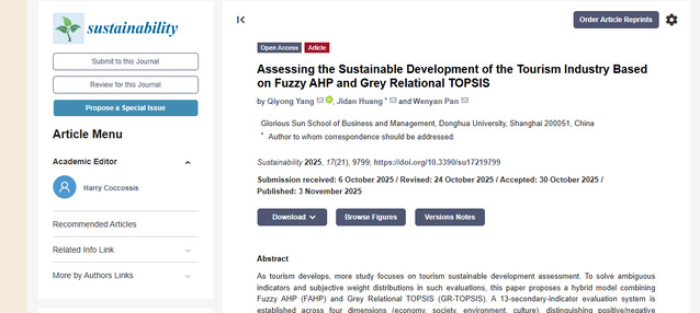 近日,我校信息管理专业本科生以第一作者身份,在国际知名期刊《Sustainability》(SCI 三区,影响因子 4.610)发表题为《Assessing the Sustainable Development of the Tourism Industry Based on Fuzzy AHP and Grey Relational TOPSIS》的学术论文,为旅游产业可持续发展评估提供创新方法论,彰显我校本科生扎实的科研能力与跨学科创新素养。
